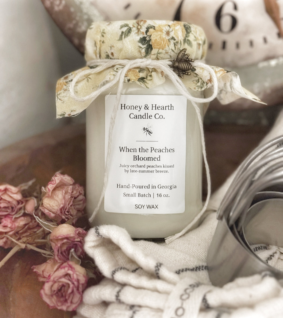 The orchard hums with golden light and velvet fruit. Juicy peaches kissed by summer air, a fragrance that ripens with warmth and memory. Soy Wax. Small Batch | 16 oz.
